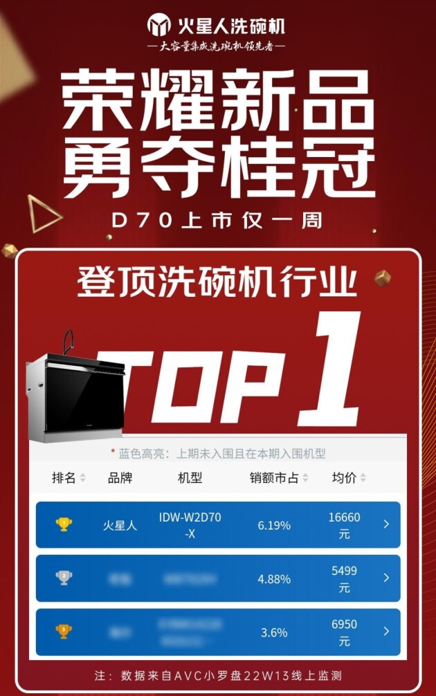 在第二曲线水洗品类方面,单款申请专利60余项、已提交申请10多项发明专利的火星人第二代集成洗碗机D70,仅上市一周便摘得洗碗机榜销量NO.1桂冠,成为洗碗机行业新贵。