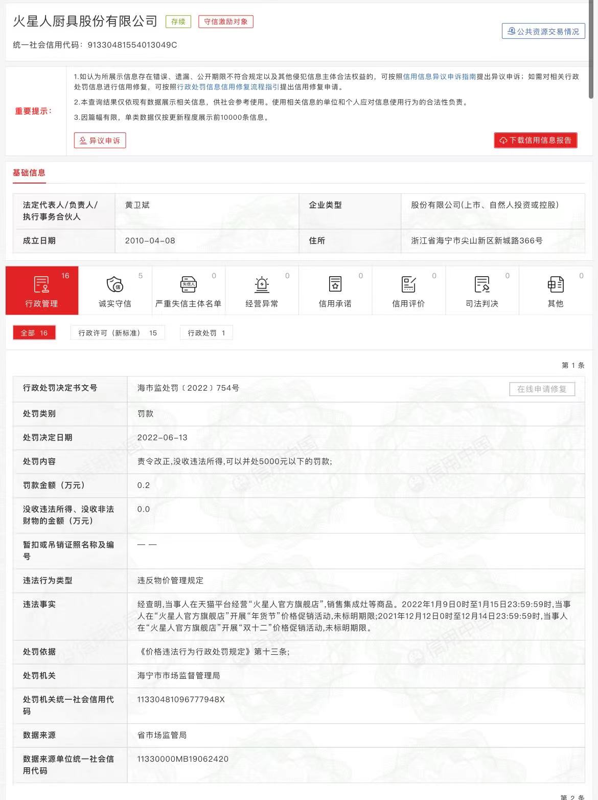 火星人厨具股份有限公司(以下简称“火星人”)新增1则行政处罚。