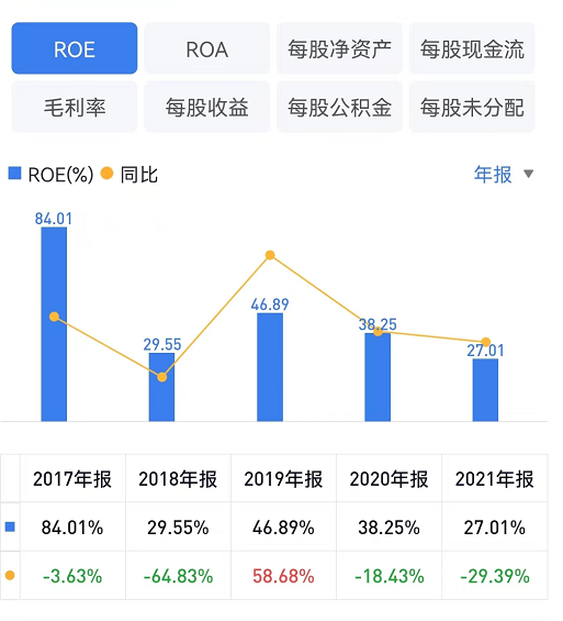 资料显示,2019年-2021年,火星人ROE分别为46.89%、38.25%、27.01%,近三年呈下滑态势。
