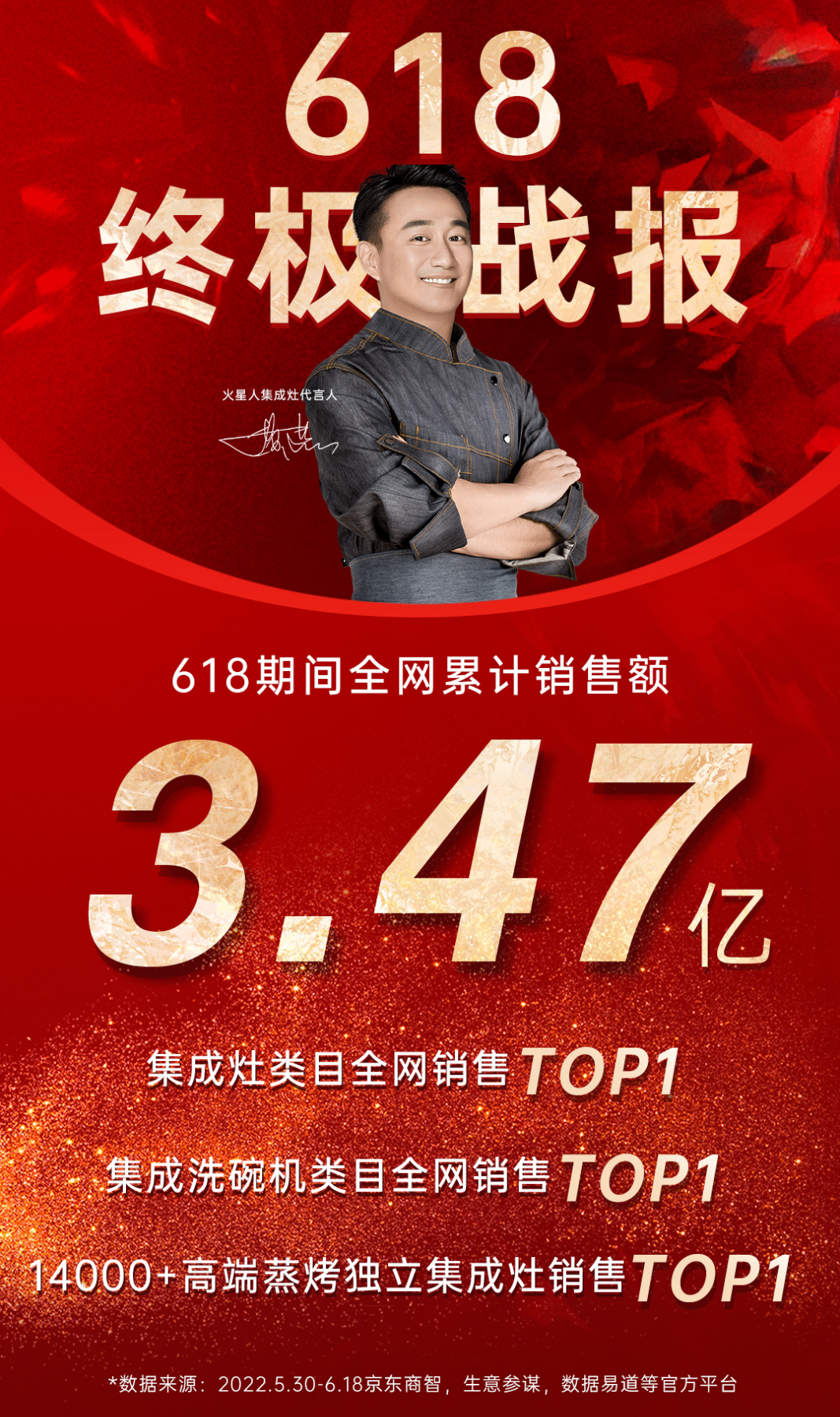特别值得一提的是,火星人较早布局电商渠道,把握线上红利,长期以来成效显著。在2022年618期间更是实现了全网销售额(GMV)突破3.47亿元的好成绩,稳居全网集成灶类目TOP1。