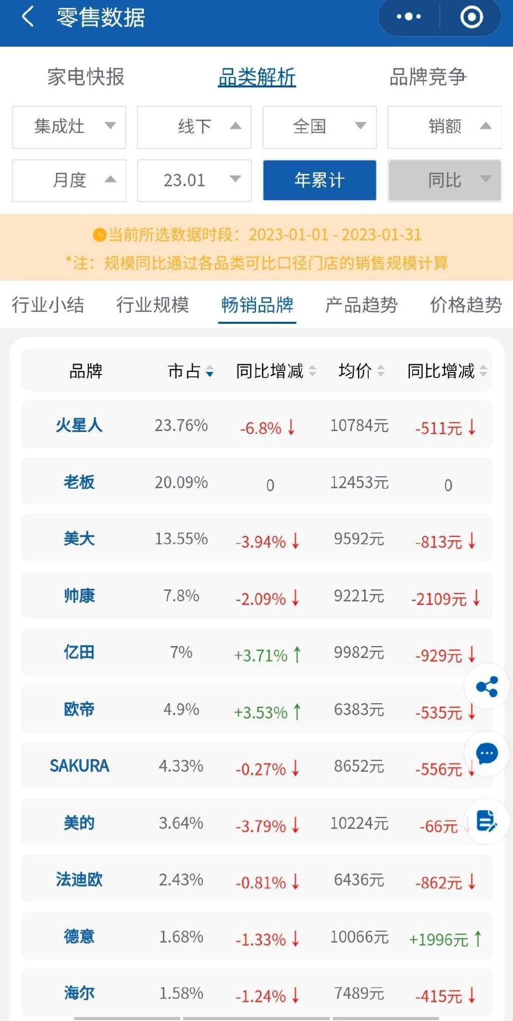 另外,对于火星人来说,还有一个重要因素需要考虑,那就是厨电巨头的“杀入”。目前,2022年以来,老板电器、方太这两大厨电巨头先后携自有品牌进入集成灶市场,并且都已经取得了不小的成绩。例如,从线下来看,奥维云网数据显示,2022年老板电器销售额份额已经达到6.62%,2023年1月老板电器销售额份额更是达到了20.09%,仅低于火星人23.76%的份额。