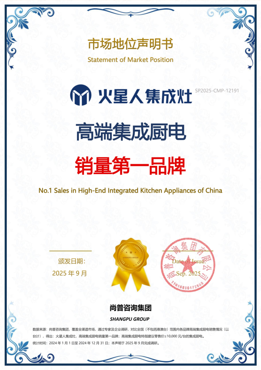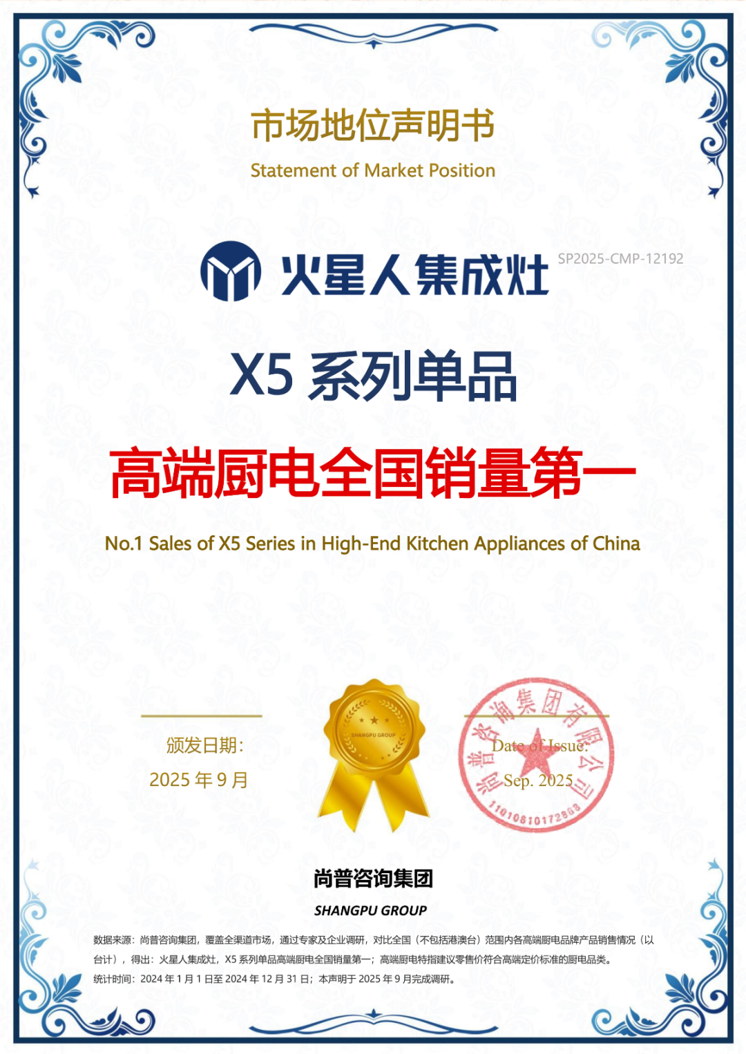 作为中国最早成立的专业市场研究公司之一,也是首批取得国家统计局涉外调查许可资质的咨询机构,尚普咨询集团对中国大陆所有推出高端集成厨电的品牌展开全链路研究——从产品功能梳理到市场动态追踪,再到行业专家深度访谈,最终基于多维数据交叉验证得出结论:火星人集成灶X5系列单品高端厨电全国销量第一,火星人集成灶则为“高端集成厨电销量第一品牌”。