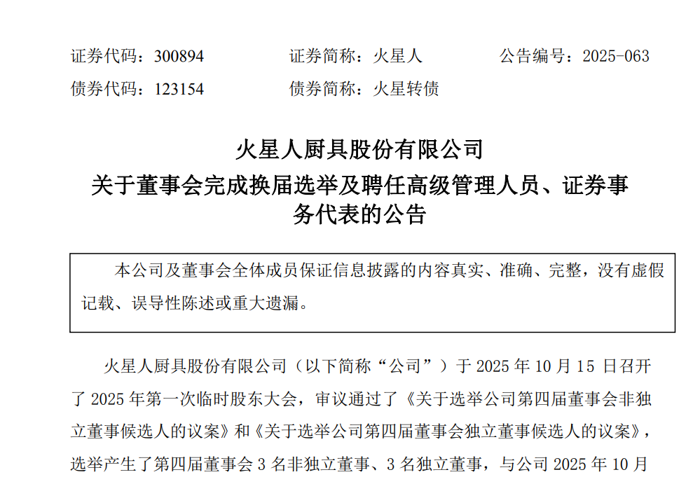 10月16日,火星人(300894.SZ)发布公告,公司已完成第四届董事会换届选举及高级管理人员聘任。