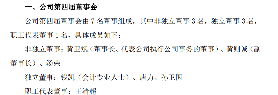 董事会具体成员如下:非独立董事为黄卫斌(董事长、代表公司执行公司事务的董事)、黄则诚(副董事长)、汤荣;独立董事包括钱凯(会计专业人士)、唐力、孙卫国;职工代表董事为王清超。