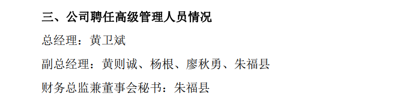 火星人聘任的高级管理人员包括总经理黄卫斌、副总经理黄则诚、杨根、廖秋勇和朱福县,财务总监兼董事会秘书为朱福县。此外,证券事务代表为徐玲。值得关注的是,朱福县身兼三职。