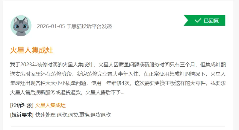 在黑猫投诉等平台上,多位消费者反映了火星人产品的品控与售后问题。一位用户详细投诉称,其于2023年购买的集成灶,在入住后一年内维修次数达四次,最近一次故障需更换主板等重要部件,但售后以“超过三个月换新期”为由拒绝换新或退款,问题拖延近两月未解决,严重影响了正常生活。这类案例并非孤例,共同指向品牌“解决生活焦虑”的宣传与现实中可能存在的品质短板、服务缺失之间的尖锐对立。
