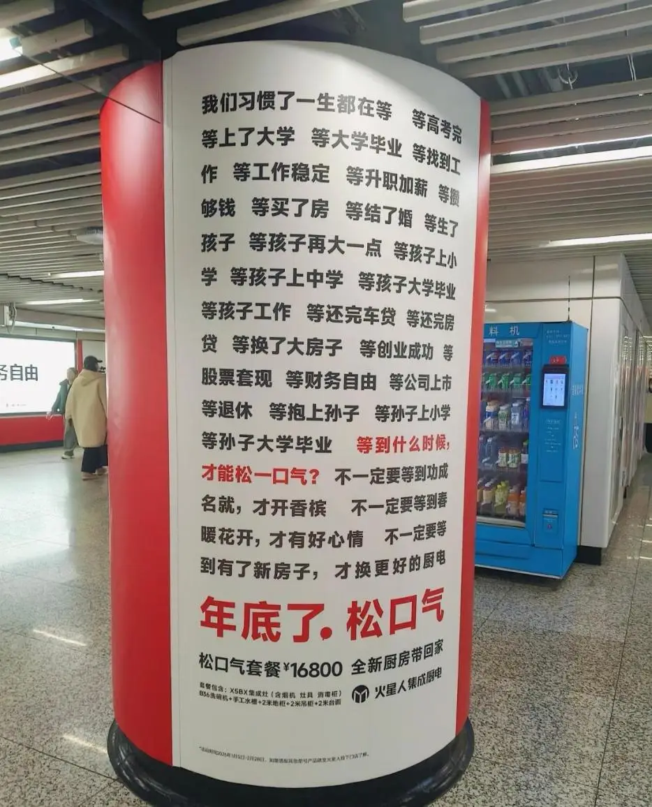 广告中“年底了,松口气”的标语与高达16800元的产品标价并列,被众多网友指责为“精准贩卖焦虑”——它如同镜子般映照出都市人关于工作、住房、育儿等一生的“等待清单”,却在放大情绪后,提供了一个看似遥不可及的高价解决方案。这种生硬的情绪营销迅速遭到反噬,广告被调侃为“断气套餐”,品牌方在舆论压力下已暂时撤下相关物料。