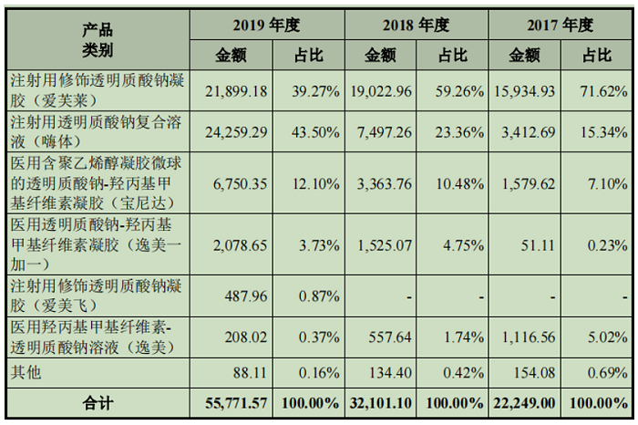 2017年,刚推出市场的嗨体便创造了3412.69万元的销售收入,占整体营收比例的15.34%;2018年和2019年,嗨体的销售收入分别为7497.26万元和24259.29万元,分别增长119.69%和223.58%。2020年,尽管公司没有披露具体的销售数据,但从市场预估来看,嗨体的销售额大概在4亿元左右,同比增长64.89%。