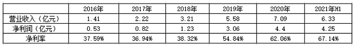 2016-2020年,爱美客营业收入分别为1.41亿元、2.22亿元、3.21亿元、5.58亿元和7.09亿元,年复合增长率49.8%;归母净利润分别为0.53亿元、0.82亿元、1.23亿元、3.06亿元和4.4亿元,年复合增长率69.8%。更重要的是,公司净利率由2016年的37.59%提升至2020年的62.06%,并在2021年上半年进一步提高至67.14%。