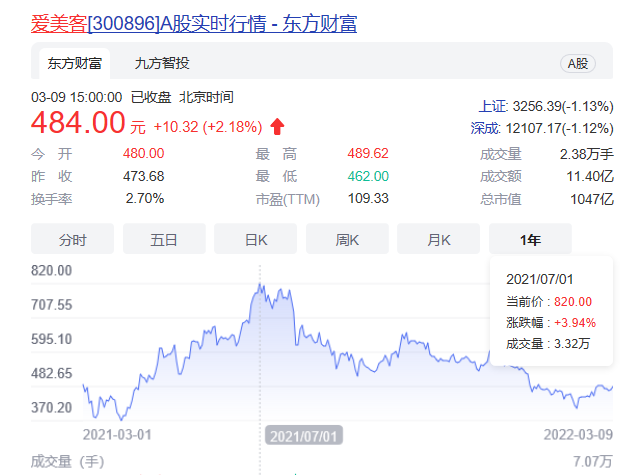 截至3月9日收盘,爱美客的股价较去年高点,跌去了41%,市值蒸发近千亿。