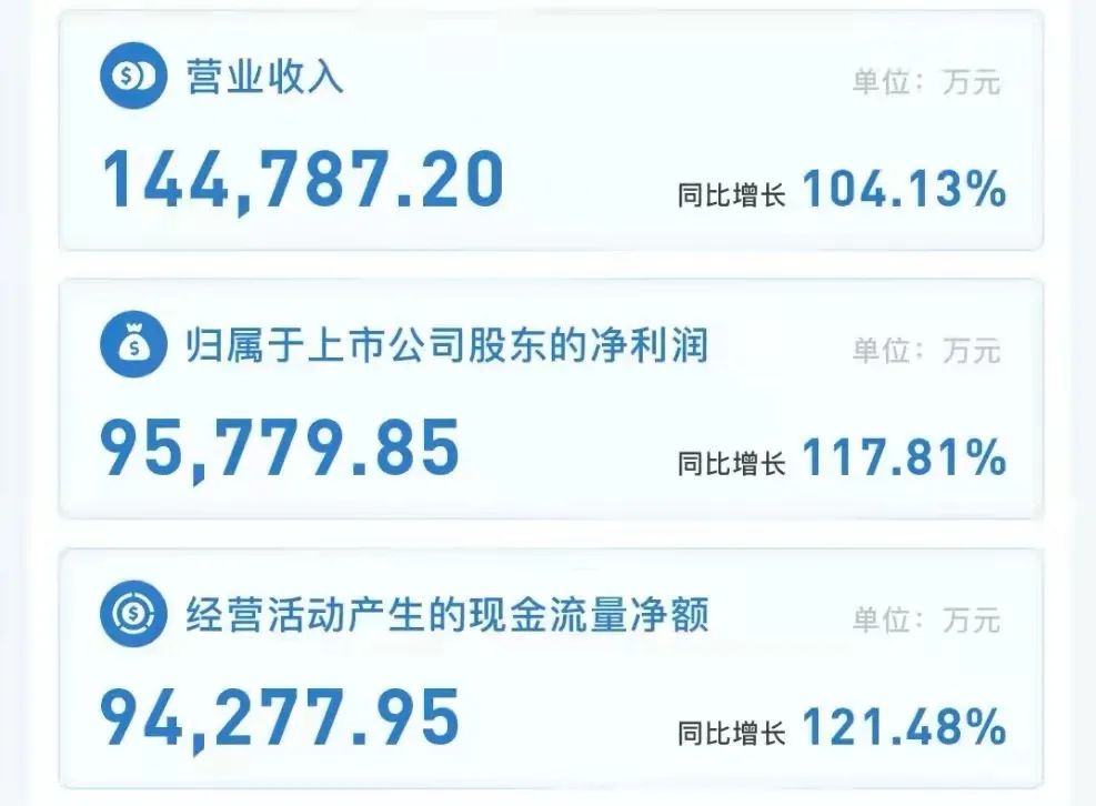 2021年,爱美客实现营收14.48亿元,同比增长104.13%;净利润9.58亿元,同比增长117.81%。