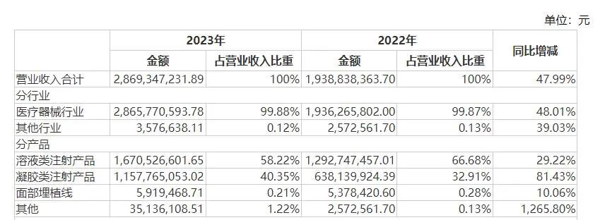 其中,溶液类注射产品实现营业收入16.7,亿元,较上年同期增长29.22%;凝胶类注射产品实现营业收入11.5,7亿元,较上年同期增长81.43%。