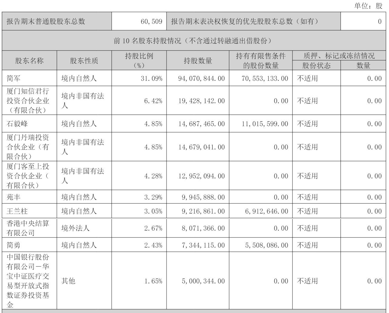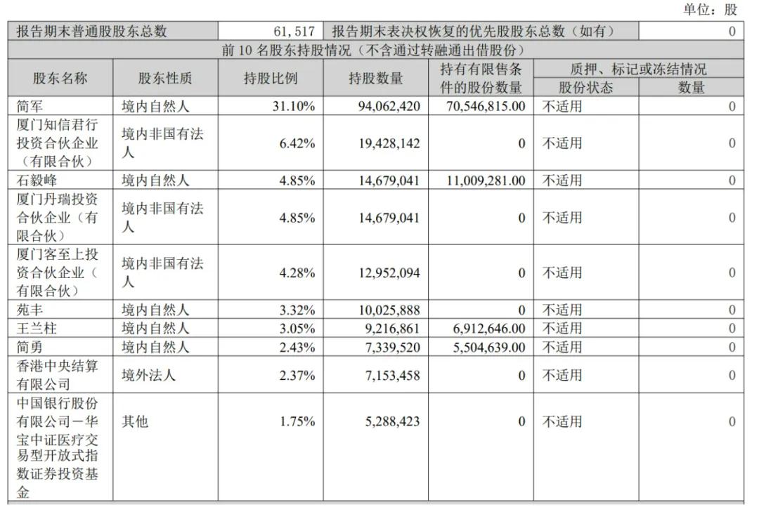 截至2024年9月30日,简军持股31.1%,厦门知行军投资管理合伙企业(有限合伙)持股6.42%,石毅峰、厦门丹瑞投资合伙企业分别持股持股4.85%,厦门客至上投资合伙企业(有限合伙)持股4.28%;