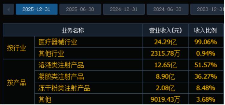 凝胶类注射产品在2025年实现收入8.9亿元,较2024年的12.16亿元下降约24%,收入占比从40%下滑到36%。