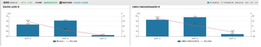 财报显示,2025年爱美客实现营业收入24.53亿元,较上年同期的30.26亿元下降18.94%;实现归属于上市公司股东的净利润为12.91亿元,同比下降34.05%;扣除非经常性损益后的净利润为11.00亿元,同比降幅达38.01%。