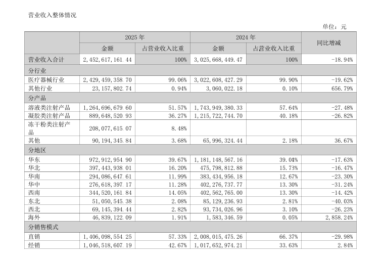 作为国内最早入局玻尿酸原料生产的厂商之一,爱美客一直是医美行业的领头羊,近95%的超高毛利率也被很多投资者戏称为“医美茅”。然而,年报数据显示,爱美客2025年业绩出现上市以来最严重的下滑态势,盈利能力大幅缩水。全年实现营业收入24.53亿元,同比下降18.94%;归母净利润12.91亿元,同比下滑34.05%;扣非归母净利润10.99亿元,同比下滑41.30%。三大核心盈利指标同步下滑,反映出公司核心业务盈利能力持续弱化。