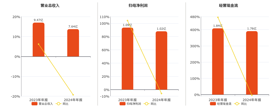 公司营业总收入为7.64亿元,较去年同报告期营业总收入减少1.83亿元,同比较去年同期下降19.29%。归母净利润为1.02亿元,较去年同报告期归母净利润减少651.61万元,同比较去年同期下降5.98%。经营活动现金净流入为1.76亿元,较去年同报告期经营活动现金净流入减少778.60万元,同比较去年同期下降4.23%。