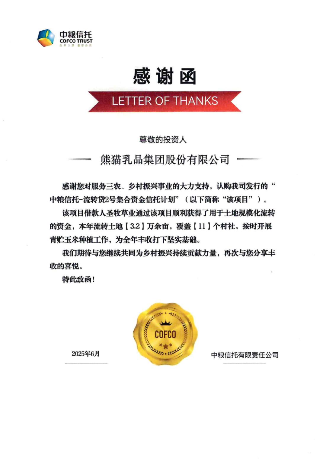 近日,熊猫乳品集团股份有限公司收到了一封来自中粮信托有限责任公司的感谢信。信中对熊猫乳品积极认购“中粮信托-流转贷2号集合资金信托计划”表达了诚挚谢意,并肯定了熊猫乳品对服务三农、乡村振兴事业的支持与贡献。