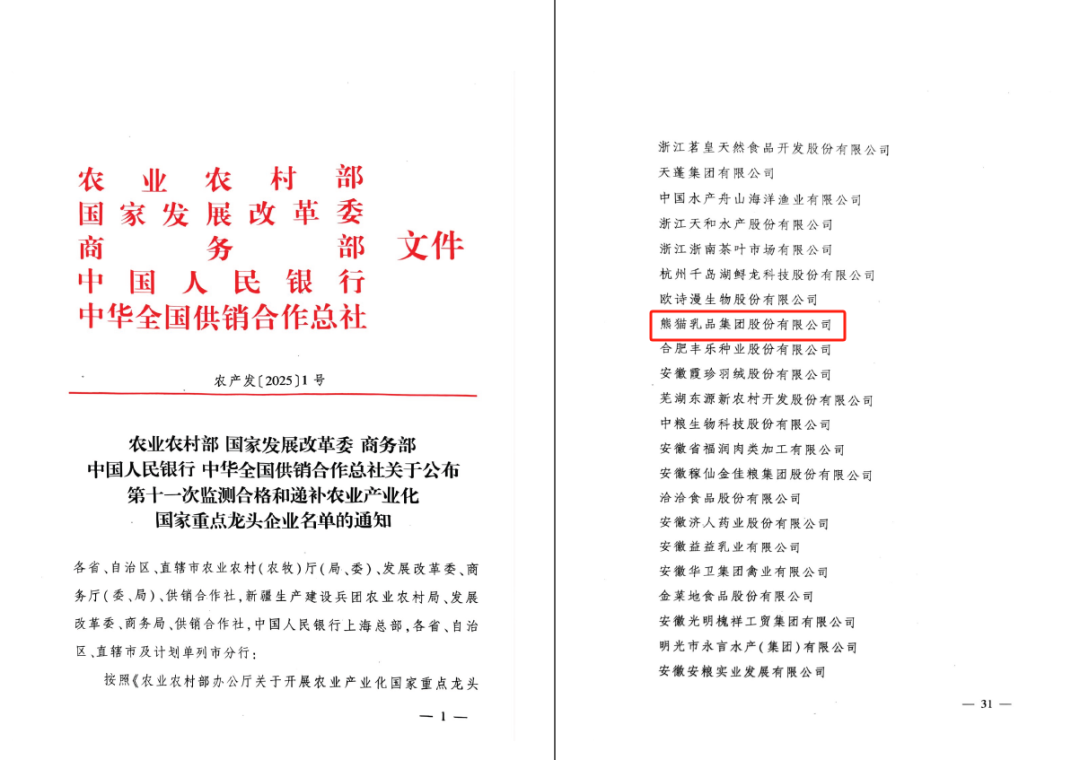 近日,国家农业农村部公布了第十一次农业产业化国家重点龙头企业监测合格名单。熊猫乳品集团凭借稳健的经营发展、卓越的产品品质与对农业产业链的突出贡献,顺利通过监测,再次荣膺“农业产业化国家重点龙头企业”称号!