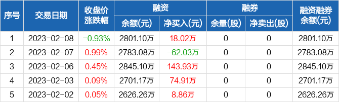 融资方面,当日融资买入74.6万元,融资偿还56.58万元,融资净买入18.02万元。融券方面,融券卖出0股,融券偿还0股,融券余量0股,融券余额0元。融资融券余额合计2801.1万元。