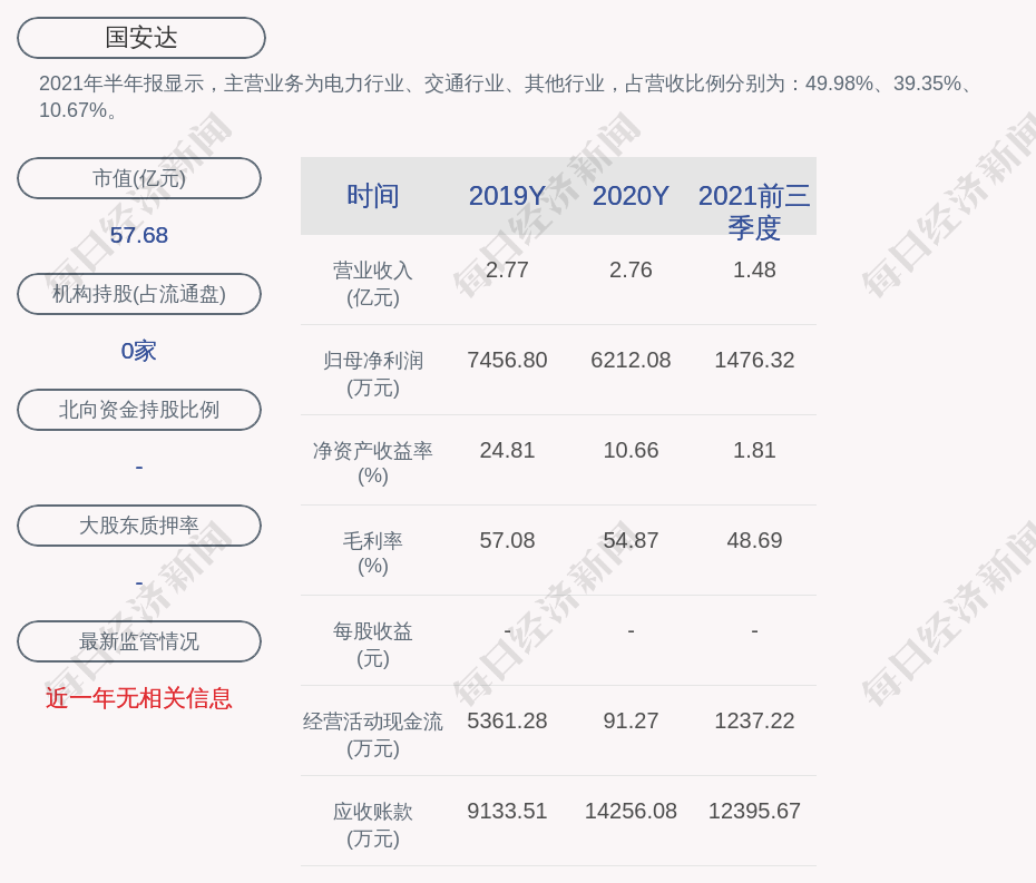 2021年半年报显示,国安达的主营业务为电力行业、交通行业、其他行业,占营收比例分别为:49.98%、39.35%、10.67%。
