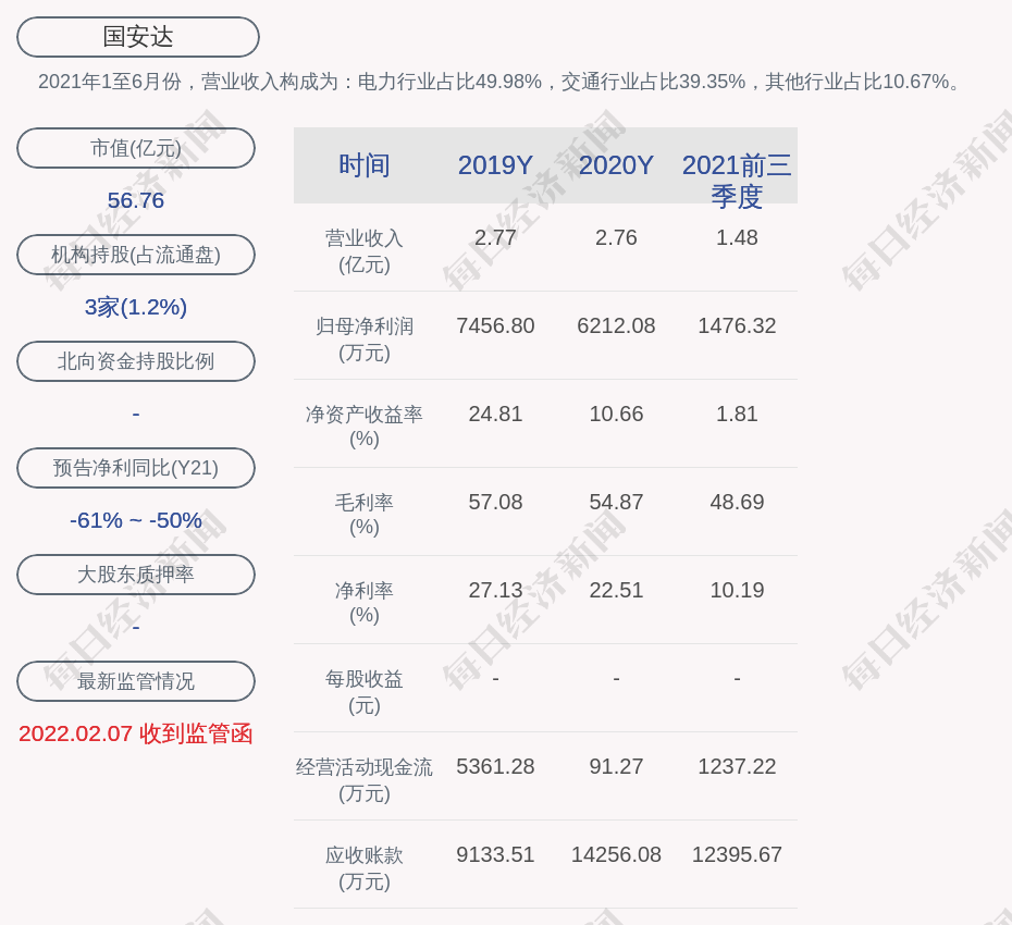 2021年1至6月份,国安达的营业收入构成为:电力行业占比49.98%,交通行业占比39.35%,其他行业占比10.67%。