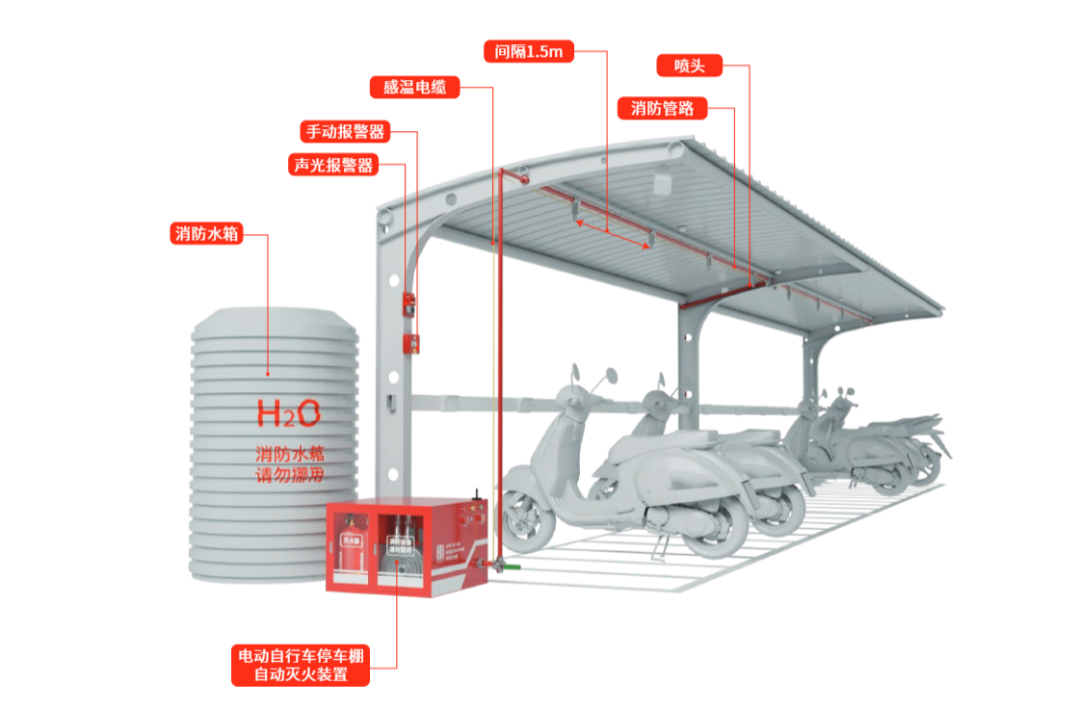 自行车棚固定式灭火系统专为电动自行车停车充电场所设计,集多维度火灾探测、及时报警、自动灭火于一体。遇火情时,系统即刻启动,雾化释放高效环保泡沫灭火剂,实现火源区域精准覆盖,有效遏制火势蔓延,快速扑救并持续抑制,自身所采用的“消防储备水自供应”模式有效解决了使用环境无可靠水源问题,免去消防取水管路铺设的复杂工程,使得在没有可靠消防水源的情况下,遭遇火情系统即刻启动,全方位保障电动自行车停放场所安全。