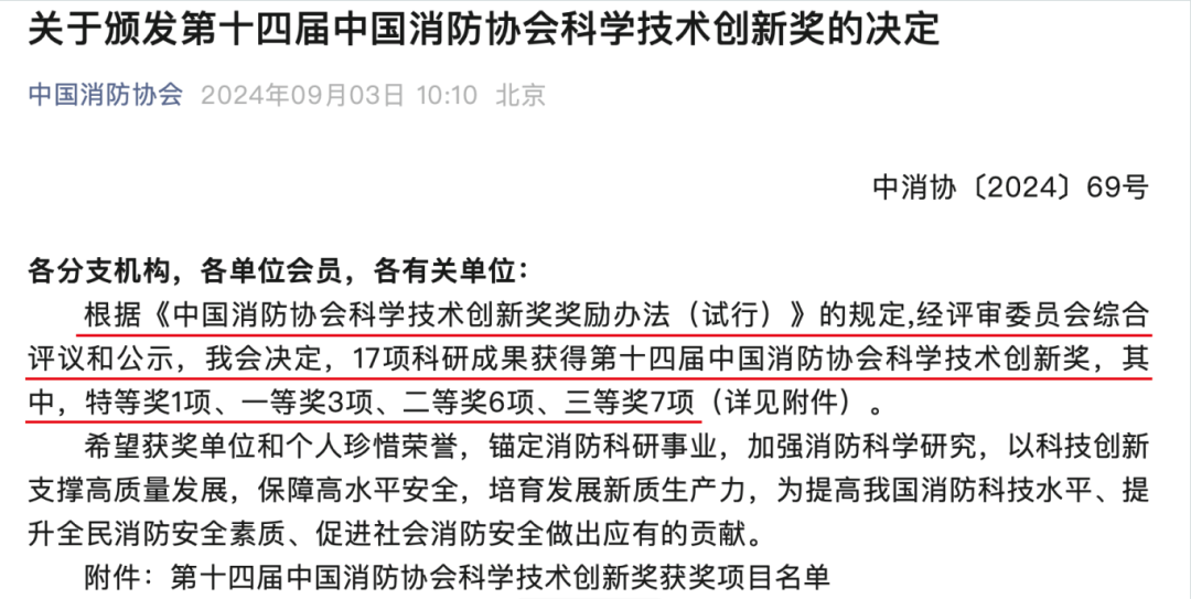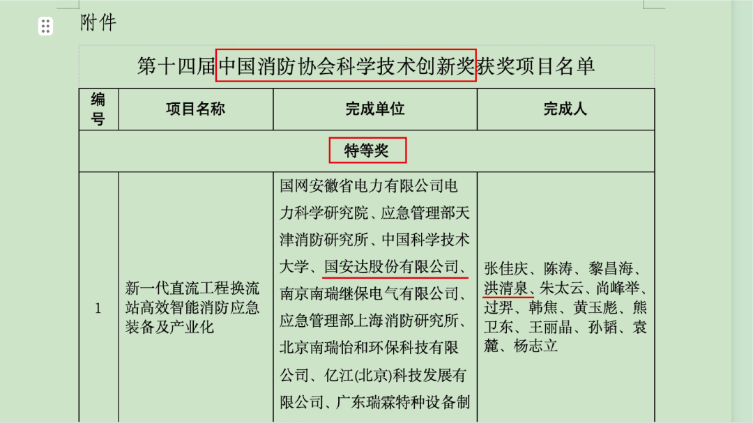 9月3日,中国消防协会公布了第十四届中国消防协会科学技术创新奖获奖名单。国安达股份有限公司联合国网安徽省电力有限公司电力科学研究院、应急管理部天津消防研究所、中国科学技术大学等国内顶尖科研机构和企业共同推出的创新科研项目“新一代直流工程换流站高效智能消防应急装备及产业化”,荣获本届科学技术创新特等奖,填补了该奖项设立13年以来的空白。该奖项也是中国消防协会科技创新领域的最高荣誉。公司荣获此殊荣,意味着公司在消防安全领域的相关技术获得行业的高度认可,体现了公司产品技术的突破性进展。