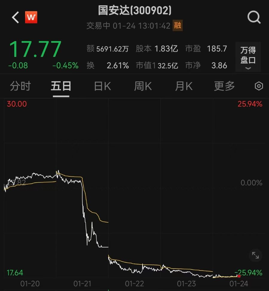 此前1月21日,国安达20CM跌停,并于1月21日—1月23日,连续3个交易日下跌。截至今日午间收盘,略跌0.17%,报每股17.82元。