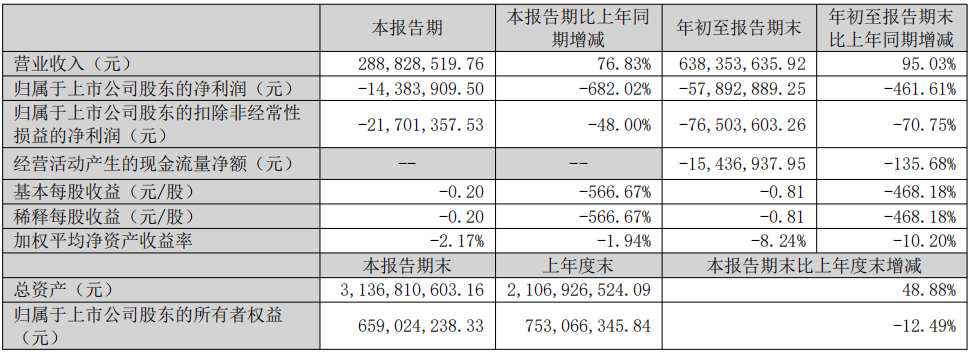 年初至报告期末,营收增长更为显著。累计营业收入6.38亿元,较上年同期的3.27亿元增长95.03%,近乎翻倍,主要因销量上涨带动;归属于上市公司股东的净利润-5789.29万元,同比下降461.61%;归属于上市公司股东的扣除非经常性损益的净利润-7650.36万元,同比下降70.75%。