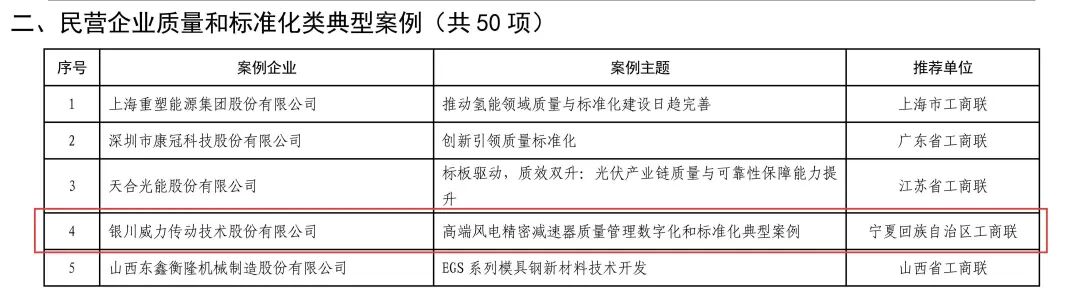 近期,中华全国工商业联合会办公厅正式发布通知,威力传动凭借在质量和标准化领域的专业实践,成为宁夏唯一入选“2025年全国民营企业发展新质生产力系列典型案例(质量和标准化类)”的企业。