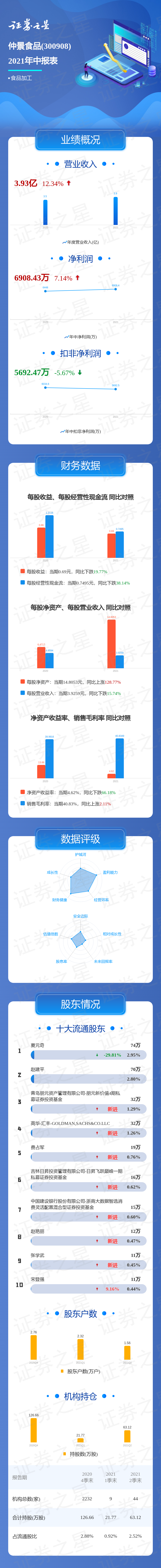 仲景食品2021中报显示,公司主营收入3.93亿元,同比上升12.34%;归母净利润6908.43万元,同比上升7.14%;扣非净利润5692.47万元,同比下降5.67%;负债率9.41%,投资收益972.17万元,财务费用-47.53万元,毛利率40.83%。
