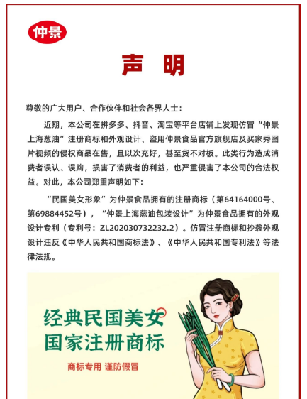 4月7日,仲景食品发声明称,公司在拼多多、抖音、淘宝等平台店铺上发现仿冒“仲景上海葱油”注册商标和外观设计、盗用仲景食品官方旗舰店及买家秀图片视频的侵权商品在售,且以次充好,甚至货不对板。