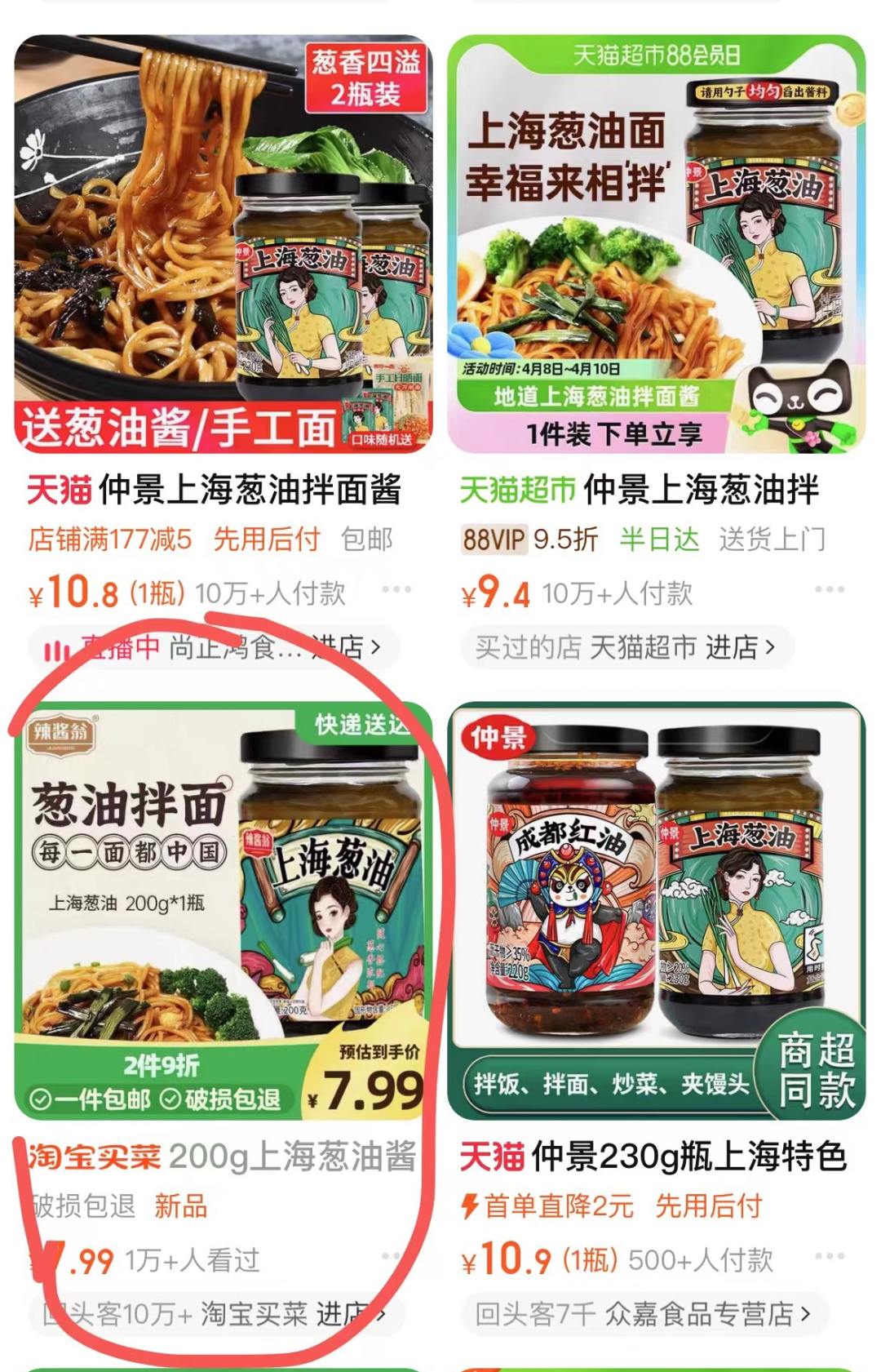 淘宝平台搜索“上海葱油”会出现与仲景牌包装相似的商品链接