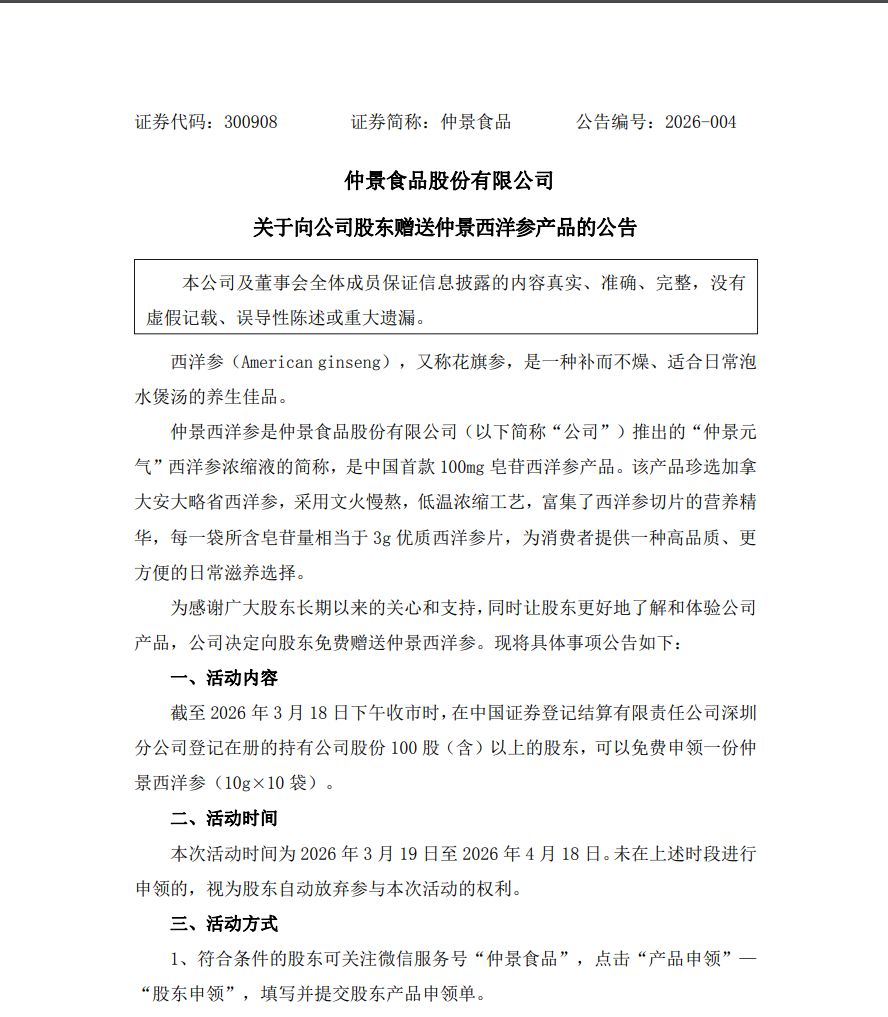 3月9日,仲景食品发布关于向公司股东赠送仲景西洋参产品的公告。公告显示,为感谢广大股东对公司的关心和支持,同时为使股东更好地了解公司产品,公司决定向全体股东免费赠送一份产品。本次的具体产品规格为“仲景西洋参”(10克×10袋)。