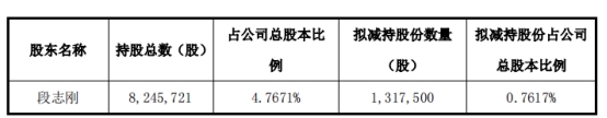 截至公告日,段志刚持有公司股份8,245,721股,占公司总股本比例4.7671%。