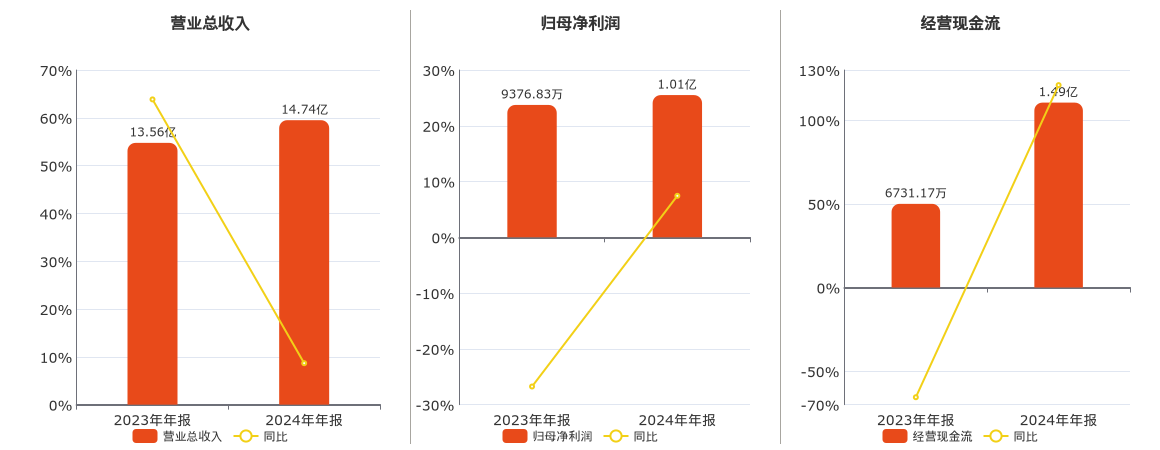公司营业总收入为14.74亿元。归母净利润为1.01亿元。经营活动现金净流入为1.49亿元。