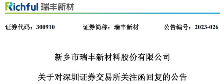 深交所10日向瑞丰新材下发关注函,追问其利润分配预案是否与公司业绩增长幅度相匹配,是否存在炒作股价的情形等。