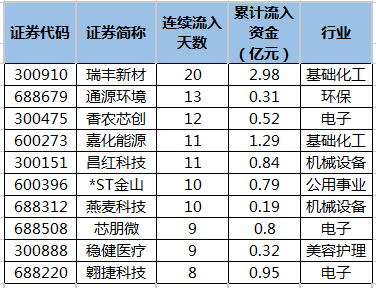 证券时报网讯,数据宝统计,截至5月12日收盘,沪深两市共有70只个股连续5日或5日以上主力资金净流入。连续流入天数最多的是瑞丰新材,已连续20个交易日净流入。连续净流入天数较多的还有通源环境、香农芯创、嘉化能源、昌红科技、燕麦科技,分别获13个、12个、11个、11个、10个交易日净流入。