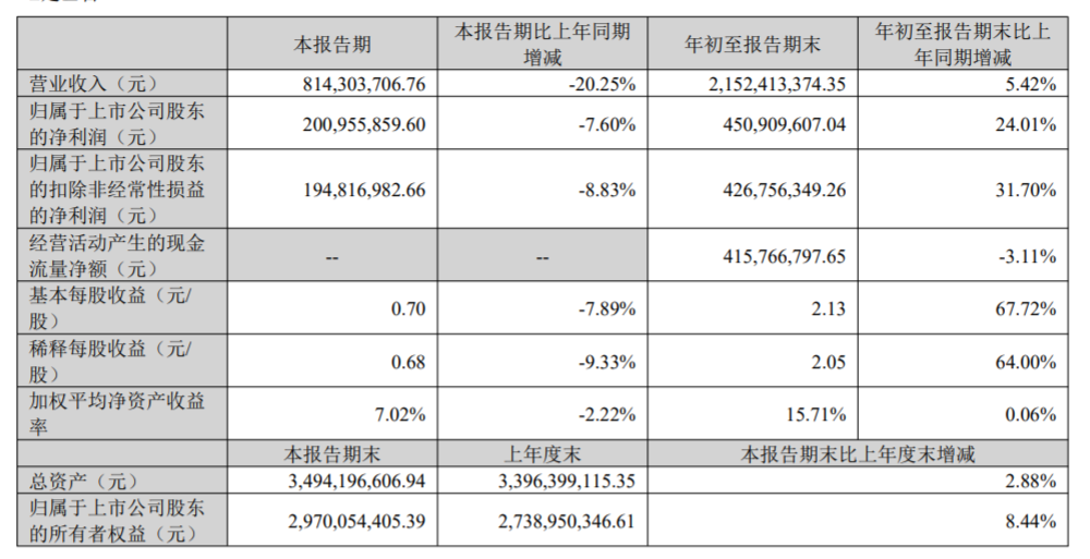 前三季度公司实现营业收入21.52亿元,同比增长5.42%;归属于上市公司股东的净利润4.51亿元,同比增长24.01%。