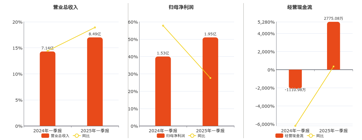 公司营业总收入为8.49亿元。归母净利润为1.95亿元。经营活动现金净流入为2775.08万元。