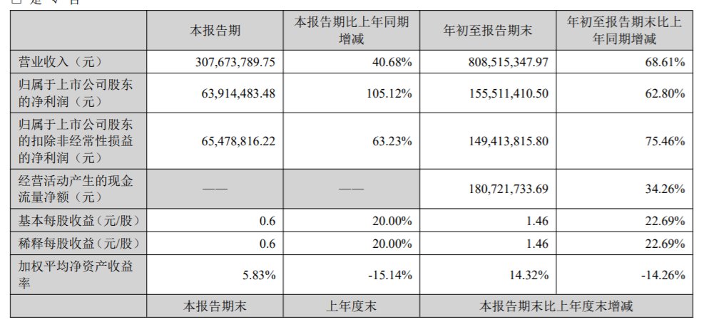 前三季度亿田智能营业收入8.09亿元,同比增68.61%;归属于上市公司股东的净利润1.56亿元,同比增62.8%。