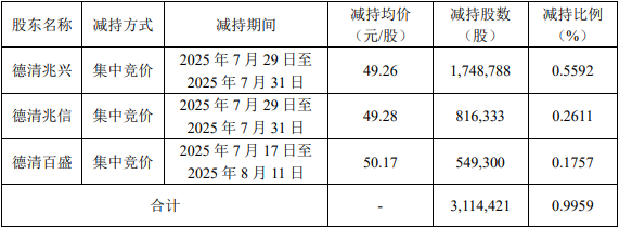 2025年7月17日至2025年8月11日,德清百盛通过集中竞价方式,减持549,300股,减持比例为0.1757%,减持均价为50.17元/股。