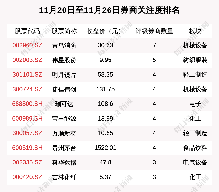 从券商对个股的关注程度来看,有29只个股获得多家券商关注,券商关注数量排名居前的个股是青鸟消防(002960.SZ)、伟星股份(002003.SZ)、明月镜片(301101.SZ)。