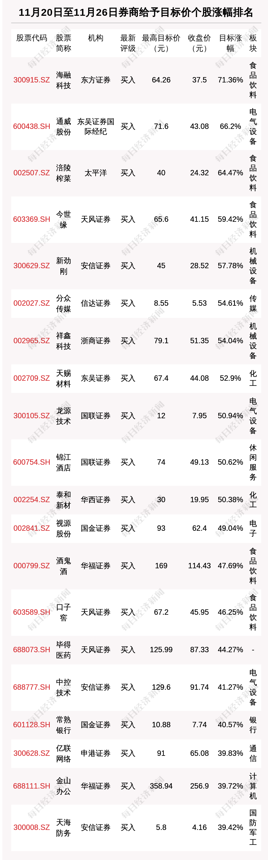 11月20日至11月26日,券商给予评级的个股数共有198只,获得买入评级的个股数共有131只。在公布了目标价格的44只个股中,按照最新收盘价计算,预期涨幅排名居前的个股是海融科技(300915.SZ)、通威股份(600438.SH)、涪陵榨菜(002507.SZ),预期涨幅分别是71.36%、66.2%、64.47%。