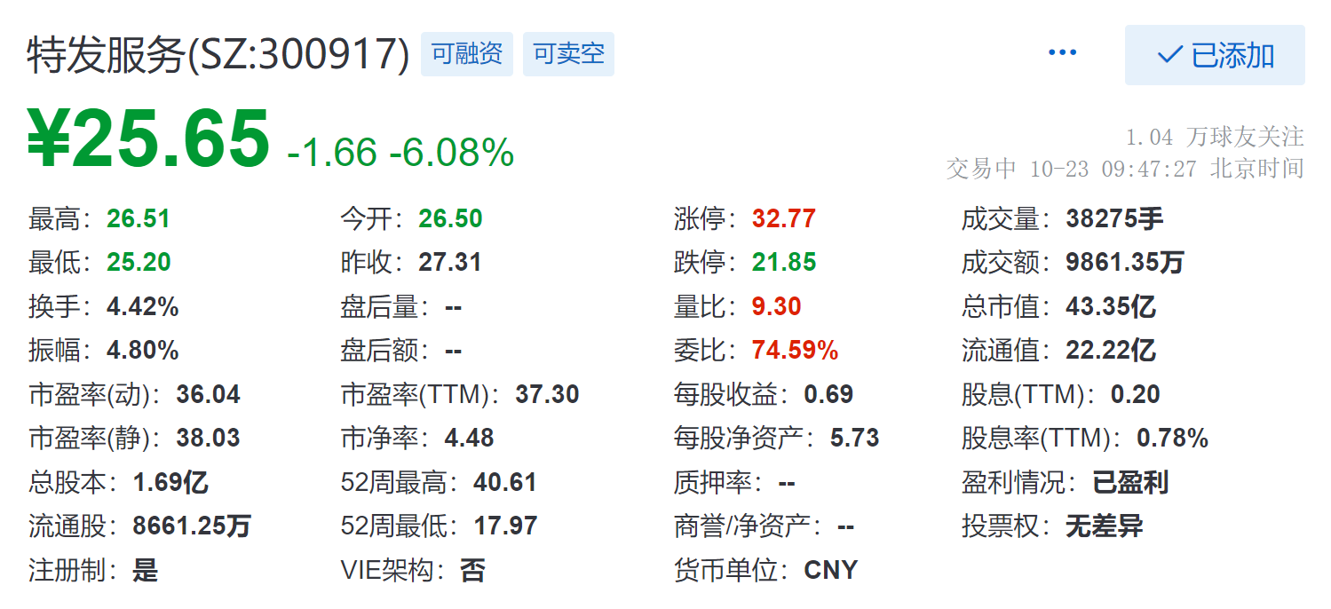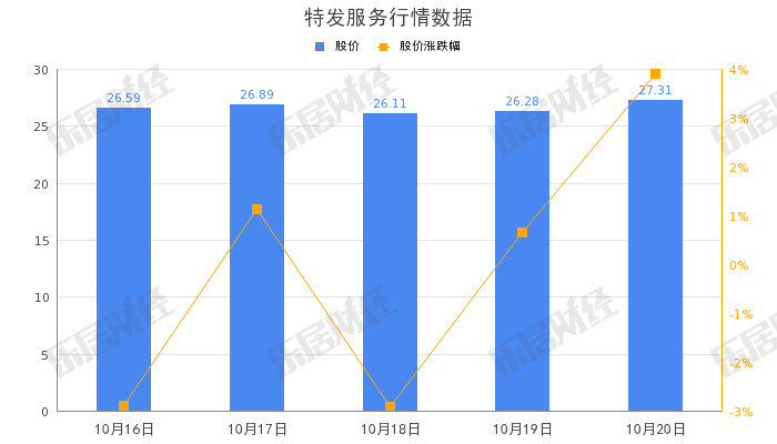 截至10月20日,特发服务(300917.SZ)股价收盘26.28元,涨3.92%,成交总额3.41亿元,总市值46.15亿元。