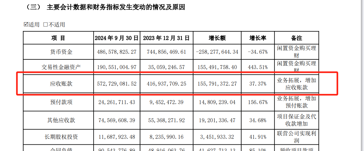 截至2024年9月30日,特发服务应收账款为5.73亿元,较2023年底的4.17亿元,增加1.6亿元,该变动主要为业务拓展,增加应收账款。