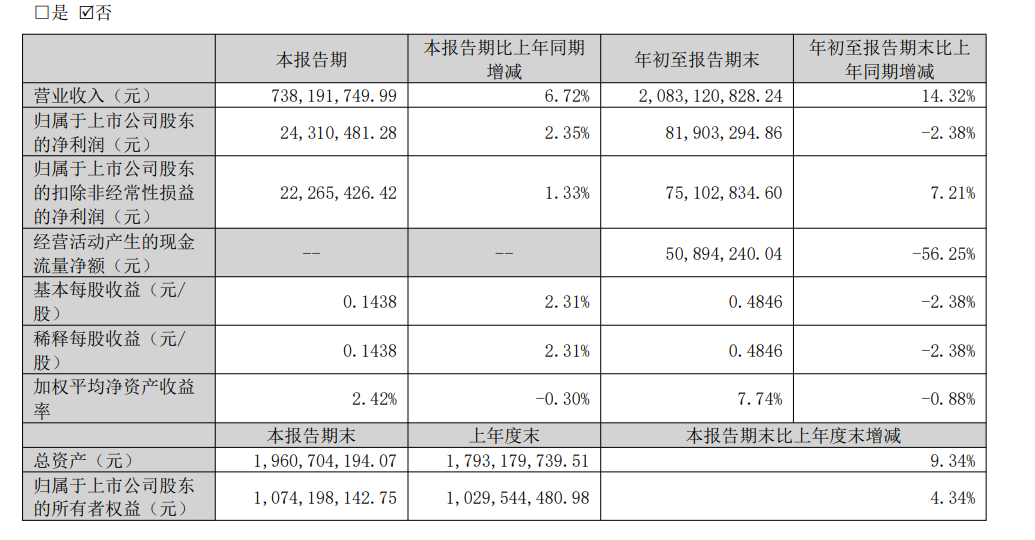 10月24日,特发服务(300917.SZ)发布2024年第三季度报告,期内,公司实现营业收入7.38亿元,同比增长6.72%;归属于上市公司股东的净利润为2431万元,同比增长2.35%。