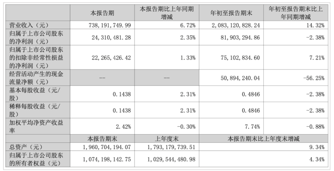 综合今年前三季度,却表现出增收不增利。今年初至第三季度末,其累计营收约20.83亿元,同比增加14.32%;对应归属于上市公司股东的净利润约8190.33万元,同比下滑2.38%。