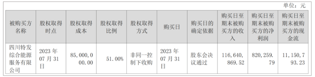 去年,特发服务落地了上市后的首笔收购,通过增资扩股获得了四川大金源天鼎物业管理有限公司51%股权,股权取得成本8500万元,正式迈入能源物管赛道。这家公司目前已更名为四川特发综合能源服务有限公司。